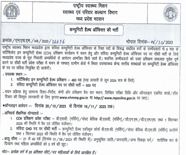 ##NHM MP CHO Recruitment 2023: नेशनल हेल्थ मिशन, मध्य प्रदेश की ओर से कम्यूनिटी हेल्थ ऑफिसर (CHO) के 980 रिक्त पदों को भरने के लिए नोटिफिकेशन जारी कर भर्ती का एलान किया गया है। नोटिफिकेशन के अनुसार इस भर्ती के लिए आवेदन प्रक्रिया 20 अक्टूबर 2023 से शुरू हो जाएगी। ऐसे उम्मीदवार जो इस भर्ती के लिए योग्यता रखते हैं वे इस भर्ती में शामिल होने के लिए निर्धारित की गयी अंतिम तिथि 16 नवंबर 2023 तक ऑनलाइन माध्यम से फॉर्म भर सकते हैं। आवेदन पत्र एनएचएम एमपी की ऑफिशियल वेबसाइट nhmmp.gov.in पर उपलब्ध करवाया जायेगा।####